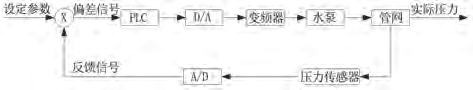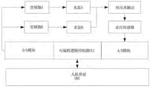 本文设计的恒压供水系统主要由可编程逻辑控制器PLC、A/D模块、D/A模块、变频器、水泵电机、水压传感器、HMI等硬件构成。PLC作为控制中枢,通过编程实现恒压供水的逻辑控制。A/D模块将水压模拟信号转变为数字信号输入PLC逻辑运算。D/A模块将PLC中的逻辑运算结果转变为模拟信号输出给变频器。变频器主要控制水泵运行频率。水压传感器时时采集输出端的水压并反馈给PLC。HMI主要用于人机交互,可实现控制、显示、报警等。通过采集输出水压信号并反馈给PLC用于逻辑控制,这样就实现了输入与输出的闭环设计,能实现动态调整控制电机转速,进而控制水压。控制原理图如图2所示。