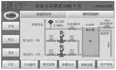 (1)手动运行模式。实现手动控制双泵的启动停止,双泵互锁。(2)自动运行模式。①单泵独立运行:在自动状态下,可以选择泵1或泵2中的任意一个启动,如选择泵1,此时另外一个水泵电机2作为备用泵。②双泵定时切换运行:单一水泵能够满足压力需求时,双泵可设定定时切换。如,定时工作时间10小时,泵1运行10小时后,自动切换为泵2运行;泵2运行10小时后,自动切换为泵1运行,依次循环。