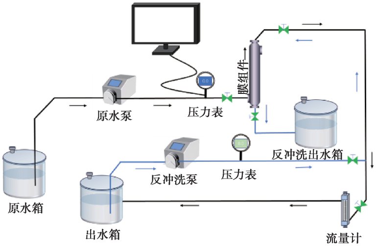 超滤试验装置由原水箱、膜组件、进水泵、压力表、流量计、反冲洗水箱、计算机等组成,如图1所示。 采用恒通量运行,在过滤过程中,每隔1 min压力表将数据传输给计算机储存,通过跨膜压差的变化来表征不同超滤膜污染的程度。 本试验探究在不同的原水污染物浓度、初始通量、水化学条件情况下,分析PVDF中膜污染的变化规律。