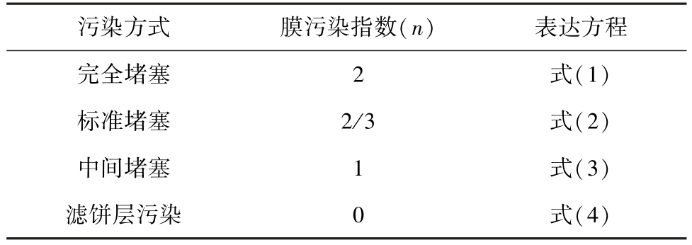 Hermia开发了4种膜滤经典模型:完全堵塞、标准堵塞、中间堵塞和滤饼层污染模型,探究膜污染机理,但是在实际水处理工程中,常采用恒通量超滤过滤。 Huang等对Hermia的膜污染模型做了进一步改进,改进的污染模型如表1所示。