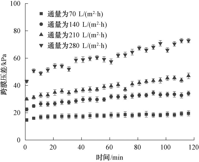 操作通量的影响:以华南地区西江原水作为超滤试验进水,通过调节蠕动泵转速来实现不同的膜通量,将膜通量调节为70、140、210、280 L/(m2·h)进行过滤,用压力表记录跨膜压差的变化。