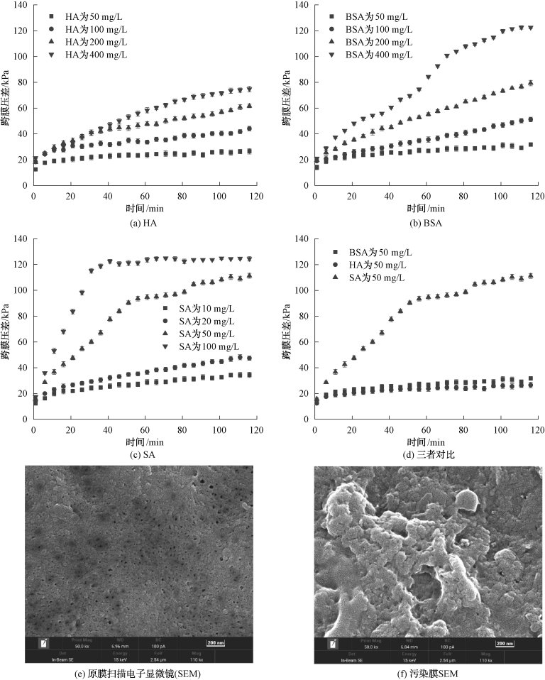 (3)与HA、BSA相比,SA由于易于黏附在膜表面,对超滤膜造成的污染最为严重。