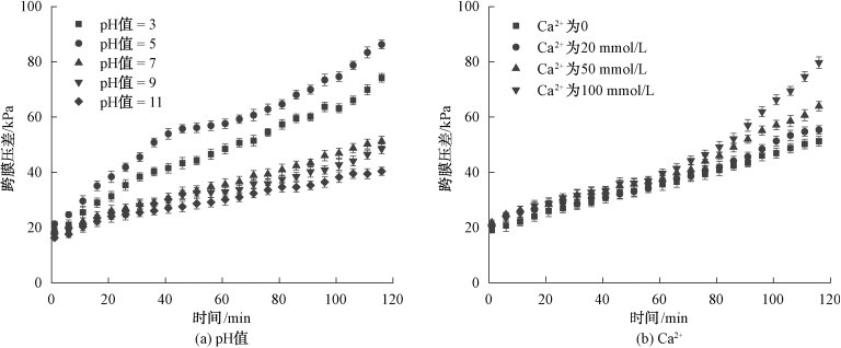 (4)当污染物pH靠近等电荷点或者增加Ca2+浓度会带来电荷屏蔽或吸附架桥作用,进而导致严重的膜污染。