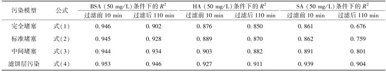 (5)在完全堵塞、标准堵塞、中间堵塞和滤饼层污染4种污染模型中,滤饼层污染(R2>0.9)为主要膜污染模型。