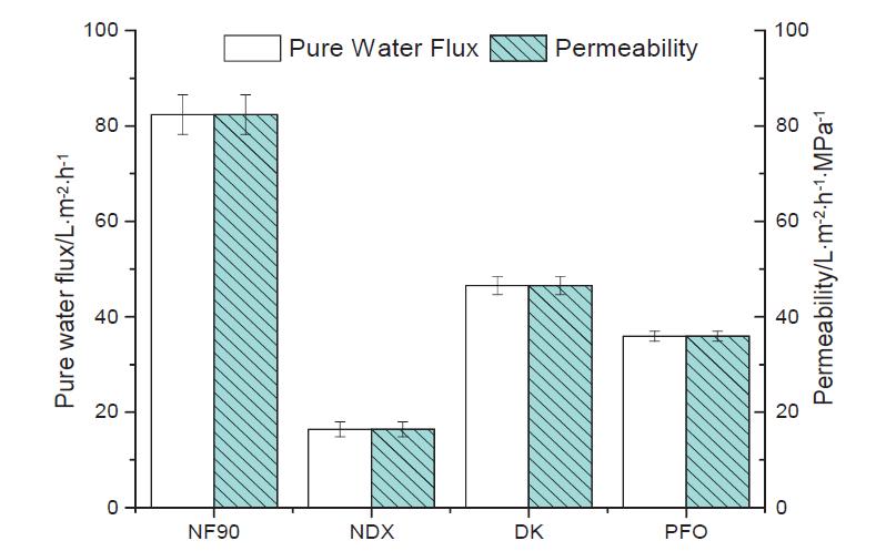 图1显示了各膜的纯水通量和渗透性。可见,NF90膜表现出最高的纯水通量和渗透性。