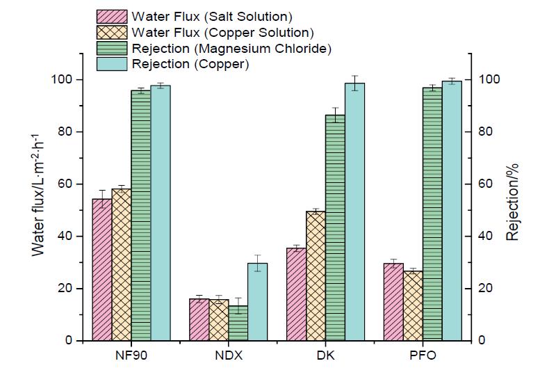 压力驱动过程获得的过滤数据对成功实施渗透驱动过程至关重要。由于将使用MgCl₂作为汲取液从含铜进料液中汲取水分子,因此需要每种溶质都具有高截留率(约90%),以确保只有水分子能透过半透膜。NDX膜显示出较低的MgCl₂截留率(<20%),使其不适用于FO/PRO过程,因为预期的高反向溶质通量(汲取溶质从汲取液向进料液渗透)可能会影响两溶液间的渗透压差。鉴于此,仅NF90、DK和PFO三种商业膜将在后续进行FO/PRO性能评估。