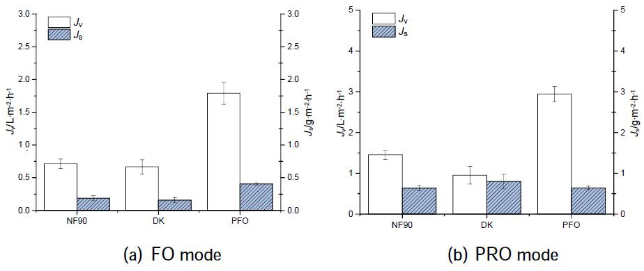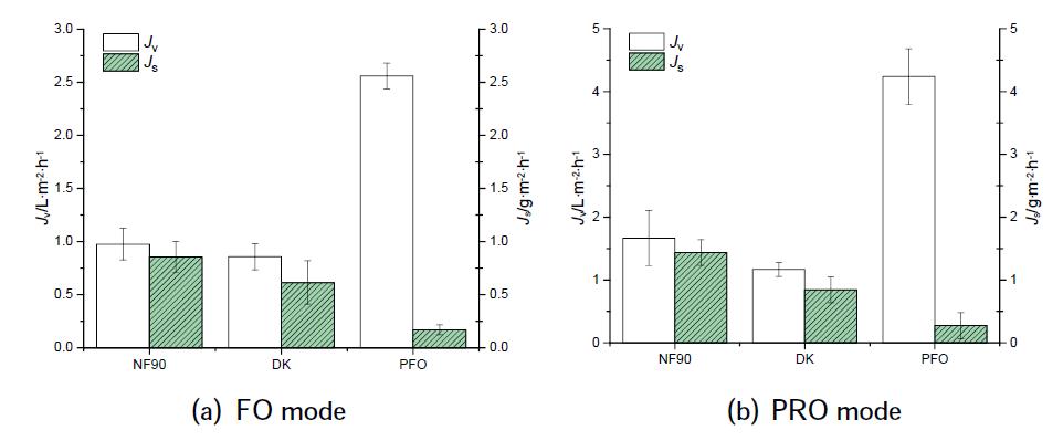 对于FO和PRO实验,PFO膜实现了最高的水通量 Jv,其次是NF90和DK膜。此外,PFO膜的反向溶质通量(0.16-0.27 g·m⁻²·h⁻¹)显著低于NF90(0.85-1.44 g·m⁻²·h⁻¹)和DK膜(0.61-0.84 g·m⁻²·h⁻¹)。膜的水通量和反向溶质通量强烈依赖于膜取向;但通常,在PRO模式下测试的膜能获得更大的水通量,但同时反向溶质通量也会增加。此现象可用内部浓差极化(ICP)效应解释。PRO模式下的ICP效应较轻,因为进料液接触的是基底层而非如FO模式下接触致密的活性层。参考图1结果,PFO膜在渗透驱动过程中的水通量优于NF90和DK膜。这进一步揭示了膜的整个结构(上下表面)在FO/PRO过程中都至关重要。NF90和DK膜水通量显著较低可归因于其作为TFC膜支撑层的无纺布的存在。