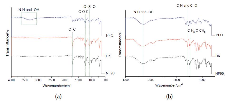 清晰可见,与它们各自的顶面相比,NF90和DK膜的底面在3700-3100 cm⁻¹处未检测到宽峰,表明底面亲水性低于顶面聚酰胺层。由于两个膜表面都直接与水性溶液接触(根据膜取向,可能是汲取液或进料液),其亲水表面对最小化ICP影响非常重要。波数1459 cm⁻¹(C=C芳香环伸缩)、1503 cm⁻¹(伸缩)、1242 cm⁻¹(不对称C-O-C伸缩)、1151 cm⁻¹(对称O=S=O伸缩)和1293 cm⁻¹(O=S=O伸缩)处的峰对应于由聚砜制成的TFC膜中间层的特定官能团。顶面在1585 cm⁻¹和1552 cm⁻¹处的峰分别对应于C-N伸缩和C=O伸缩,表明聚酰胺层的特征。底面在1711、1241和718 cm⁻¹处检测到的峰证实了用于无纺布制造的材料(聚酯)。