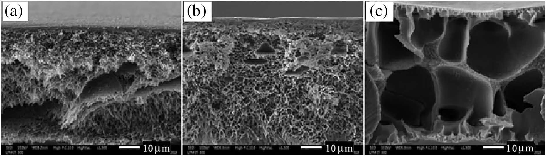 使用接触角测量仪(DataPhysics OCA),以纯水为探针液体,通过静态接触角(CA)测量分析膜上下表面的润湿特性。报告室温下在每个膜不同位置进行十次测量的平均值。使用Thermo Scientific Nicolet 5700记录膜上下表面的傅里叶变换红外(FTIR)光谱。采用衰减全反射(ATR)模式在600-4000 cm⁻¹波数范围内采集光谱,扫描16次,分辨率4 cm⁻¹。对于薄层复合(TFC)膜,分析时未将聚酰胺层从无纺聚酯支撑层上剥离。使用扫描电子显微镜(SEM)(Hitachi TM 3000)观察膜的截面结构及上下表面形貌。