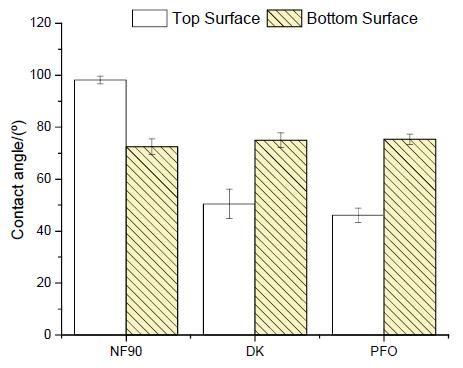 可见,NF90顶面的接触角(98.1°)显著高于其余评估的膜(42.2°-50.7°)。NF90膜的高接触角在文献中常有报道,但这并不真正表明该膜是疏水的,因为膜表面粗糙度也可能因Wenzel或Cassie效应影响接触角测量值。关于底面接触角,所有三种膜显示出非常相似的值(72.5°-75.4°)。